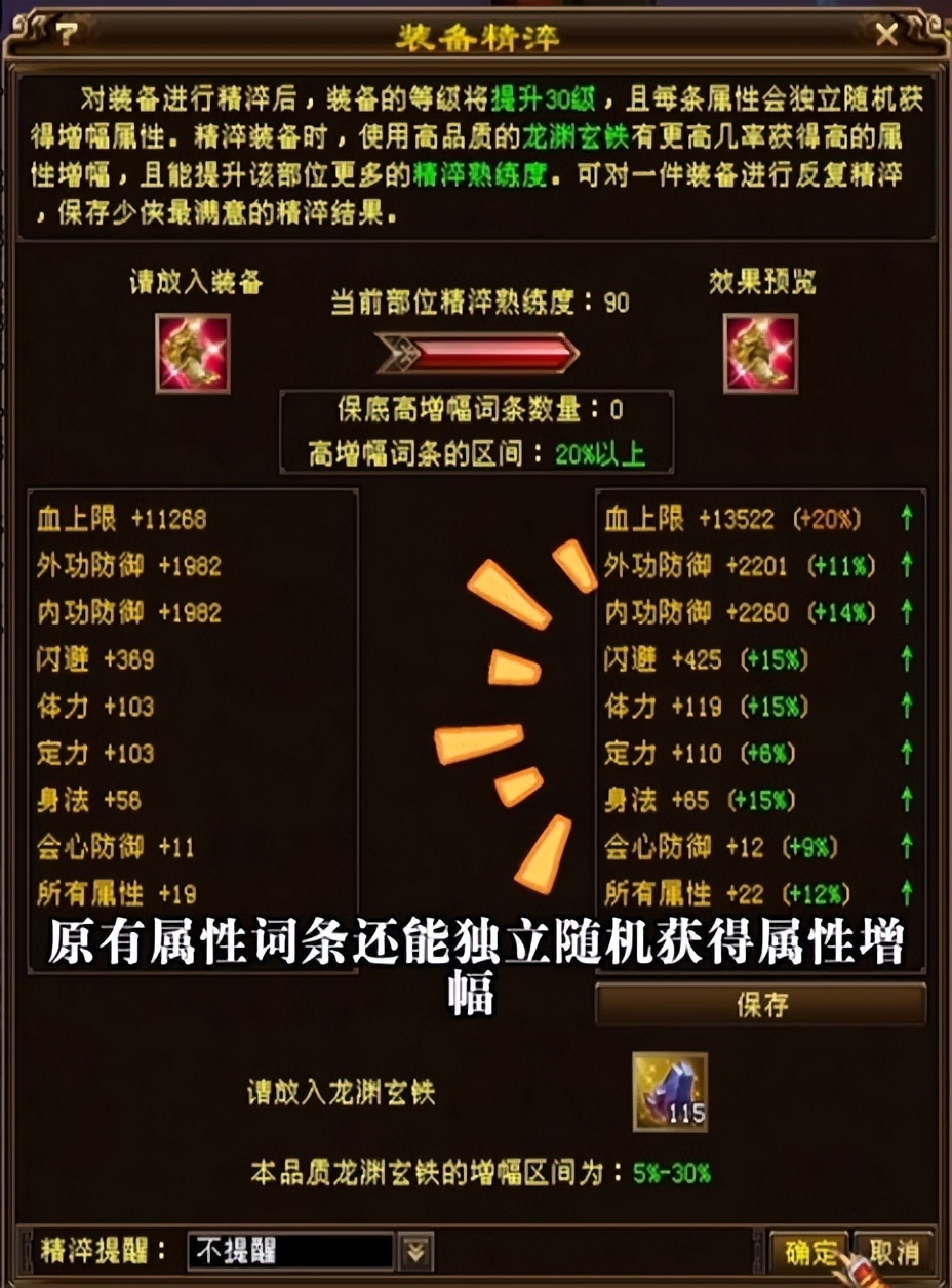 假如你是一个装备党,爽玩的秘籍告诉你“精淬爽=战斗爽”。打架是为了精淬材料,而装备精淬出好的属性,又能去打一场好架,再获得材料,再精淬,再去挑战更难的副本,直接开启良性循环。甚至等级突破后,无需重造装备,只要拿打本就能掉落的龙渊玄铁,就可以对装备进行精淬,随机提升属性。
