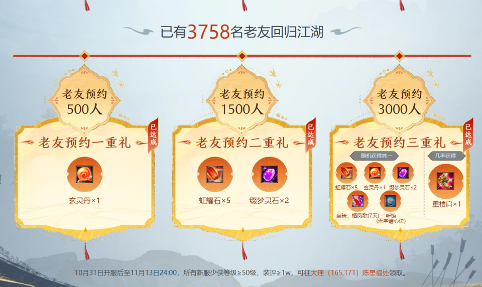 更不用担心回坑的门槛,正好可以来10月31日开服不久的新服——门派无界服【万武归宗】创号,新建角色可享30天双倍经验,永久五级宝石上限。在11月31日完成防沉迷认证,还有坐骑:炎羽(30天)相赠,助你快速找回当年战斗的感觉。
