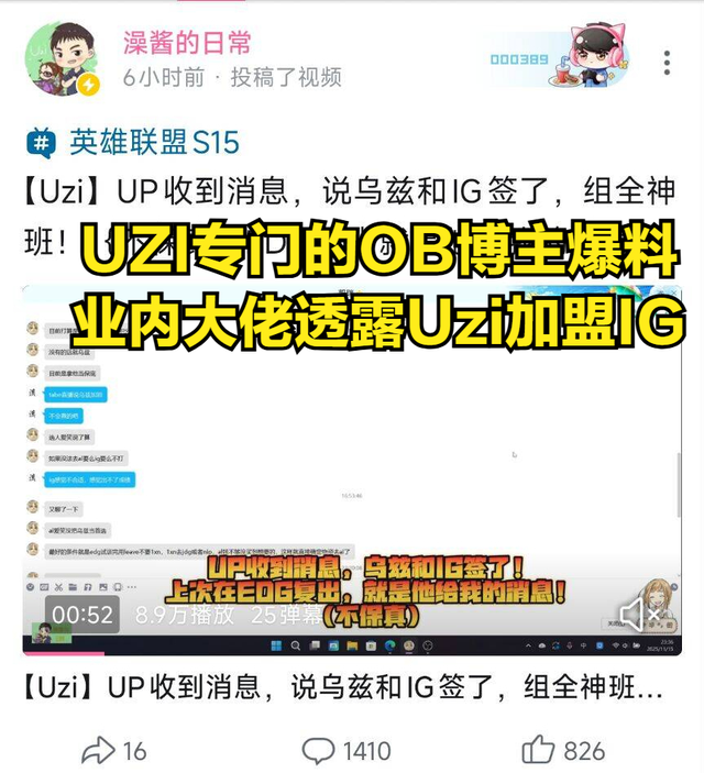 IG自从被爆出新赛季没有跟GALA续约后,很多IG粉丝都在讨论,IG未来的AD选手会是谁?其中就有一位LPL业内大佬爆料,Uzi很有可能在新赛季加盟IG战队,这个业内大佬是当初第一个爆料Uzi会在EDG复出的存在。Uzi头号粉丝还专门发视频告知Uzi粉丝,表示Uzi已经跟IG签约完毕,很多LPL观众在看见这个消息后,都对IG管理层的转会大手笔感到震惊。