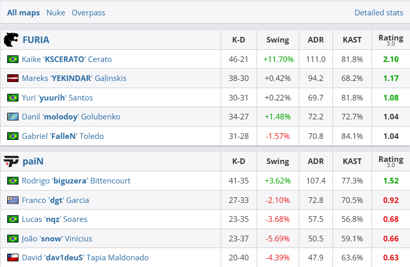 而m0NESY最大的竞争者,自然是来自FURIA的明星选手KSCERATO。在半决赛中狂砍2.10 rating的KSCERATO(1.40)是FURIA队内数据最好的选手,同样,他也与队内数据第二的yuurih(1.17)拉开了不小的差距。