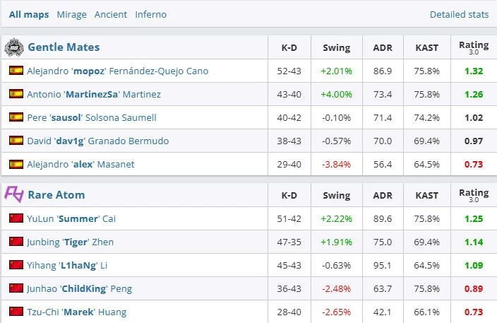 在决赛开始前,MVP的竞争已经逐渐明朗起来。从小组赛阶段开始,m0NESY就一直领跑榜单。而在半决赛结束之后,他依旧保持着1.51的超高rating。即使是队内数据第二好的kyousuke(1.14),也和他有着不小的差距。