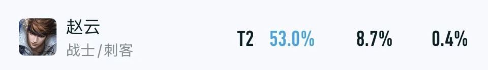 这也是赵云的全分段胜率能高达53%的原因,说明他在中低分段里的强度完全在线,拿出来冲王者乃至荣耀都没有问题。