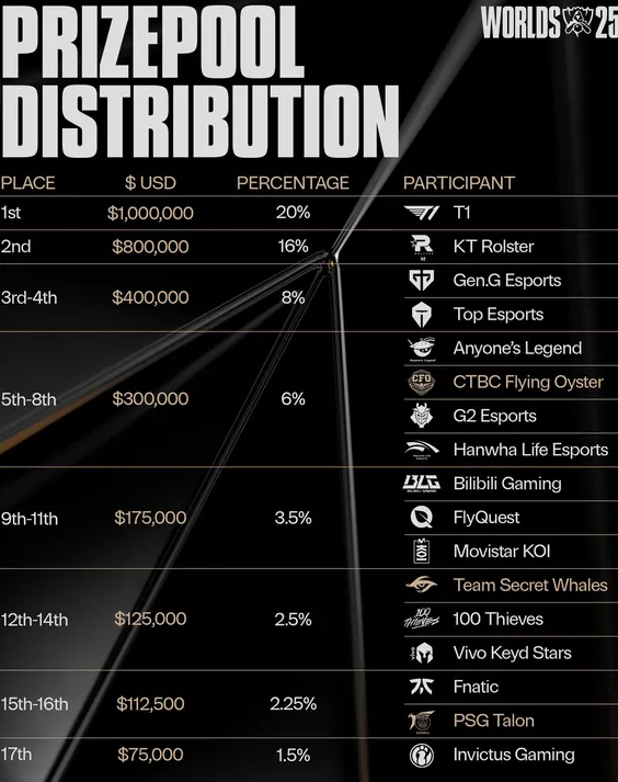 首先来看奖金结构:冠军T1拿下100万美元,这是他们又一次在世界赛登顶后的荣耀加冕,KT作为黑马闯入决赛,也凭借精彩表现获得80万美元;四强GEN与TES则同为40万美元,整体来看,今年世界赛的奖金梯度依旧明显,但各名次之间的差距并未大到夸张程度,更多像是对成绩的肯定与激励。