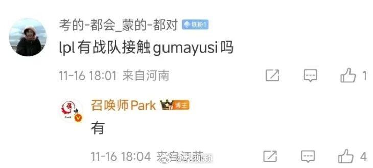 11月16日,爆料人“召唤师park”谈转会期消息:LPL有队伍正在接触Gumayusi。