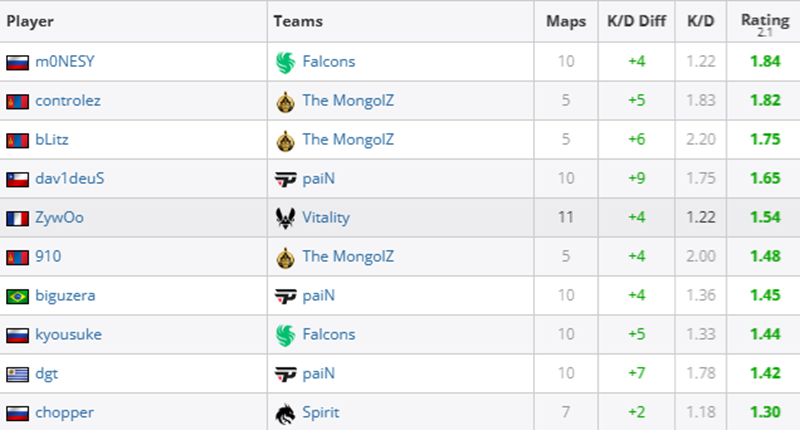 排名第一的是Falcons选手m0NESY,10图1.84 rating;第二名controlez为5图1.82 rating;第三名为bLitz,5图1.75 rating。