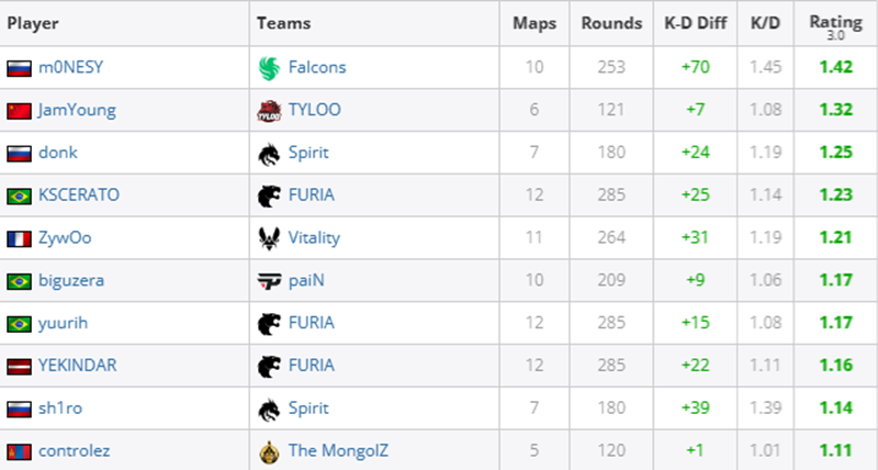 排名第一的是Falcons选手m0NESY,他在10张地图上有着1.42的rating;第二名JamYoung为6张地图1.32 rating;第三名donk为7图1.25。