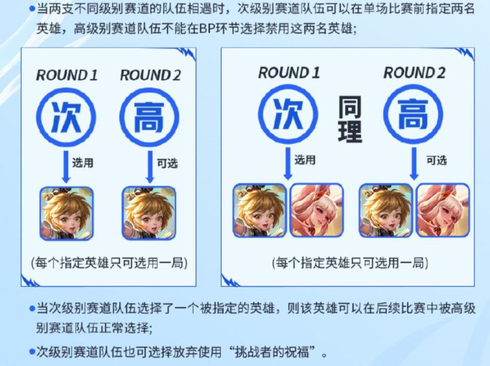 去年,挑战者杯赛“挑战者的祝福”为“次级别赛道队伍可在单场比赛指定两名英雄,高级别赛道队伍不能在BP环节选择禁用这两名英雄。”