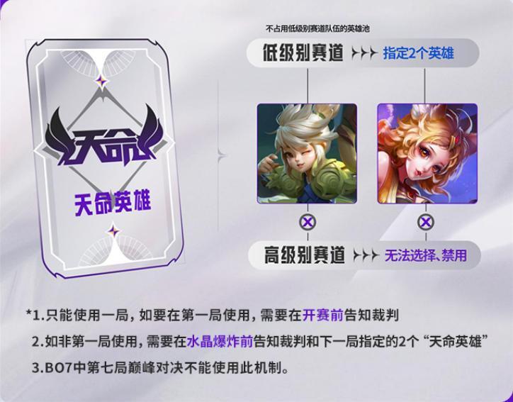 简单点总结就是,低一级的队伍可以任选两名英雄,对手无法BP,低两级的队伍可以在某一场对局中重置英雄池,同时享有“天命英雄”BUFF。