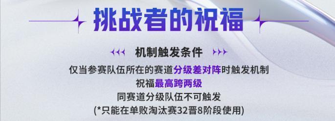 当第二档赛道的队伍遇到KPL/KGL队伍时,可以从“天命英雄”(针对BP)、“英雄池重置”两个祝福中二选一进行使用,而当第三档赛道的队伍遇到KPL/KGL队伍时,可二选二使用。