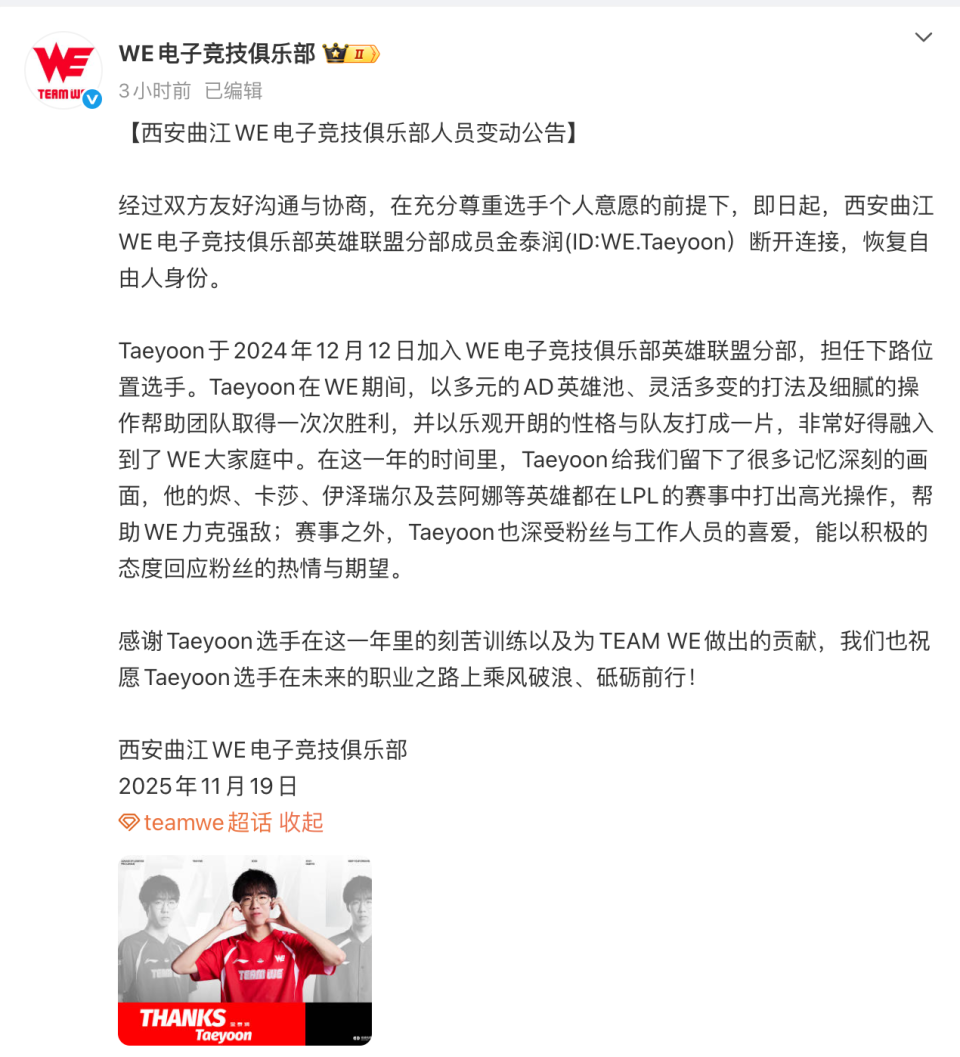 WE发布人员变动公告:Taeyoon断开连接,恢复自由人身份