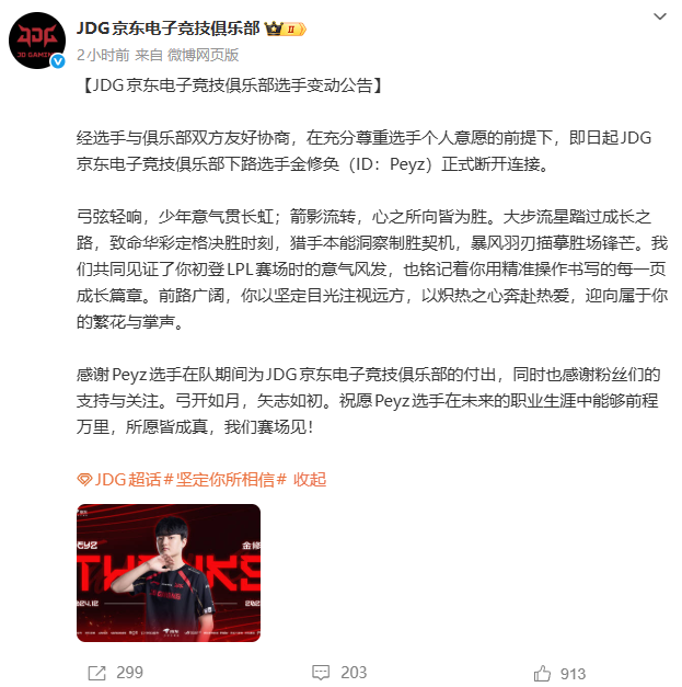 JDG官宣:在充分尊重选手个人意愿的前提下,即日起JDG京东电子竞技俱乐部下路选手金修奂(ID:Peyz)正式断开连接。紧接着T1官宣:‘Peyz’ 金修奂选手正式加入T1,将与我们同行至2028年。Peyz作为“GEN太子”,却加入了T1,还一次性签了3年的长合同,挺有趣的。LOLEsports官推调侃:第7冠为了Peyz?据说Peyz为了能加入T1,只要了很低的薪资。这也很合理,Peyz本身就出生在非常富裕的家庭,不追求高薪,而且今年Peyz在JDG打了一年,估计赚的也不少。