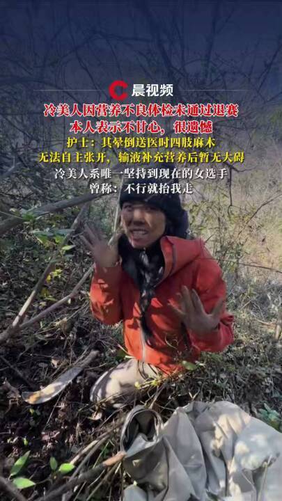 11月14日上午,七星山荒野求生比赛中最后一名女选手“冷美人”在复检现场晕倒,被紧急送医。就在两日前,“冷美人”被告知体检合格,但需要复检。之后节目组发布的视频内容称,她迎来了在荒野的第二次生理期。