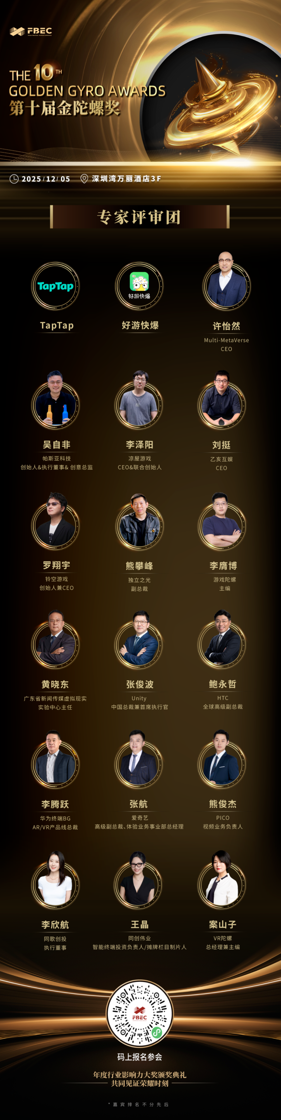 本届金陀螺奖专家评审团诚邀游戏、电竞、XR领域的权威专家、领军人物和代表企业,组成豪华评审阵容,共同见证年度行业大奖得主的诞生!