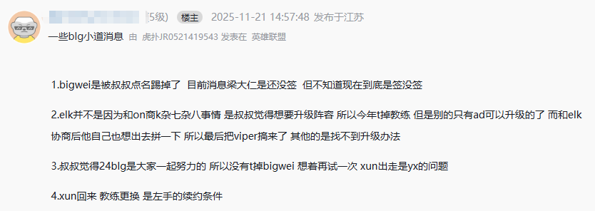 今年LPL首次实行转会竞拍,很不顺利多次修改规则,被吐槽只是为了一支超级队伍服务,而BLG确实组出了一套很好的阵容。BLG的阵容已经定了,上中辅不变,打野Xun回归,下路Elk换成了Viper。还爆料出一个感人的故事,BLG经理袁玺对Xun说:这三年的积分都是你打的,我们只想用在你身上。这可真是一段“游子归家”的佳话。不过BLG经理这句话说的有问题,今年Xun没在BLG打啊,Xun只打了23年和24年两年的积分。而打了三年积分的是Bin,Elk和On,其中Elk还被踢了,换成了S11的冠军下路Viper。也有一些网友认为:BLG今年是全队的问题,Elk只是背锅位。如今Elk被踢,明年如果没打出想要的成绩,又该谁背锅呢?另外,BLG还官宣了两位教练离队:BigWei和LvMao。BigWei在BLG的风评一直不好,LvMao也被称为吉祥物。网友拍到疑似Daeny教练现身BLG基地,身材和穿衣风格都挺像,西装加白皮鞋。但还没确定签约,如果由BigWei换成Daeny,无疑也是升级。新赛季BLG虽不再是全华班,但却是加强至臻BLG,颤抖吧LPL,BLG将是LPL最大夺冠热门!有网友爆料一些BLG小道消息,不保真,随便看看就行。BigWei被B站董事长陈睿点名踢掉,Daeny还没签;Elk并非因商K事件走,而是BLG只有AD位可以升级,Elk自己也想出去拼一下。原本的爆料是Elk将加入iG,但是反转了,“国王”Elk将要去的是WBG。有意思的是,不管是iG粉丝还是WBG粉丝,都乐于看到这一结果。iG粉丝嫌弃Elk,怕Elk和Wei不和。WBG新赛季的阵容将会是:Zika,Jiejie(小天可能休息),Xiaohu,Elk,Erha。虽然并非每个位置都是大名鼎鼎的选手,称不上银河战舰,但阵容结构有老中青三代,十分合理,可能会成为新赛季的黑马。还有一件趣事,Xiaohu已经在WBG打了很多年了,但在昨晚才关注了老板石头赶路,猜想可能是对其签下Elk的认可。这两支队伍阵容都不错,明年将是LPL冠军和世界赛名额的有力争夺者。