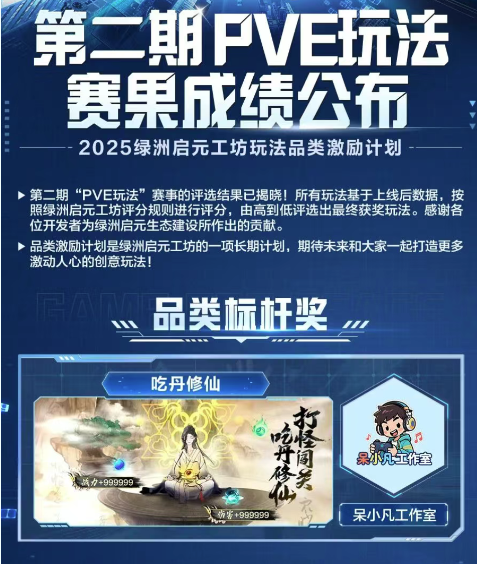11月17日,《和平精英》绿洲启元工坊公布了第二期PVE玩法赛果成绩,位于成都的呆小凡工作室开发的玩法“吃丹修仙”获得了品类标杆奖。