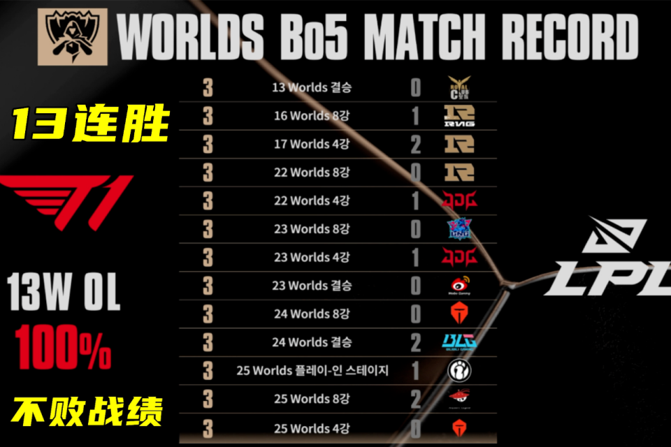 此次S15世界赛,冠军依旧是T1,作为LOL唯一一支六冠王的队伍,T1对LPL还保留着一项记录,那就是S赛BO5对阵LPL的不败战绩。从S3赛季开始,到S15赛季3-1击败IG,3-2击败AL以及3-0击败滔搏,T1已经拿到了13-0的成绩,属实是LPL久久未能翻过的高山。而在T1的世界赛幕后故事中,他们也是聊到了此事,Faker更是谈到了对于LPL这项纪录的看法。