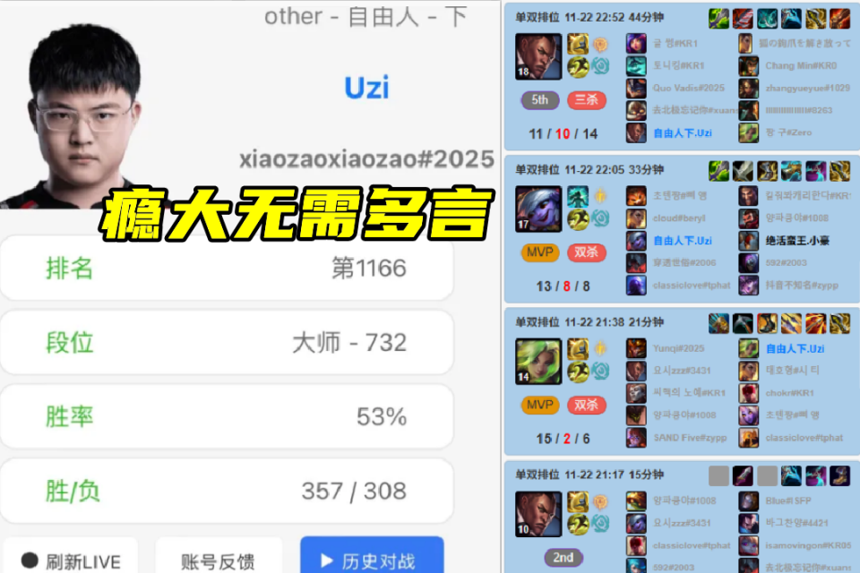 瘾大无需多言!自从LPL在S15世界赛拉垮之后,Uzi复出的呼声就一直很高,而他本人也是给力,在韩服疯狂rank,从白天打到凌晨,甚至一波连胜直接冲上了韩服700分。对于他如此高频率的韩服rank,粉丝都猜测他是想复出,虽说他本人进行了辟谣,但也似乎成了反向自证,根本没有多少人信。或许正如朱开所说,Uzi之所以打rank,只是想试试看自己到底还有没有能力复出。