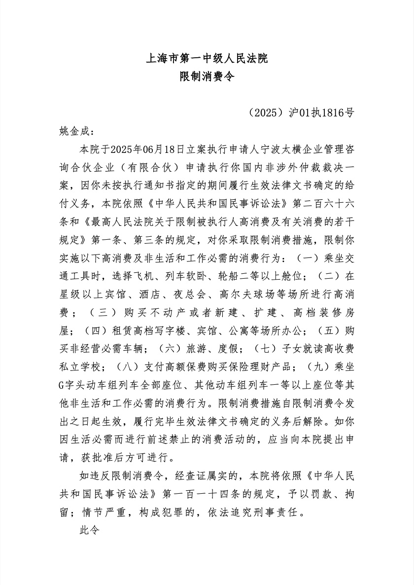 中新网11月24日电(吴家驹)中国执行信息公开网显示,近日,姚金成因未按执行通知书指定的期间履行生效法律文书确定的给付义务,被采取限制消费措施,申请人为虎牙旗下宁波太横企业管理咨询合伙企业(有限合伙),涉及国内非涉外仲裁裁决一案。