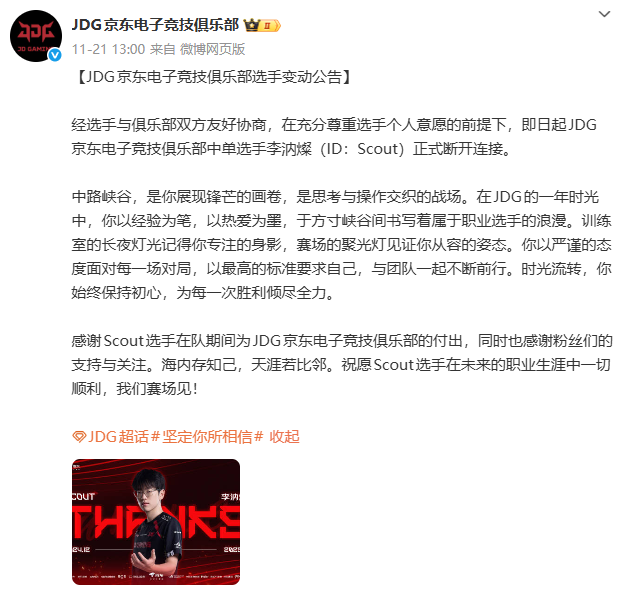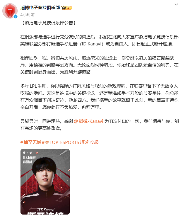 滔搏官宣:打野选手Kanavi成为自由人,即日起断开连接。HLE今年的打野小花生要去服兵役,HLE原本想签Canyon,但没聊下来。LCK也没啥好的打野了,于是HLE签下Kanavi。Kanavi在LPL联赛很强,但在国际赛表现平平,尤其是对阵LCK队伍,很容易上头送,经常被喷“精忠报国”,尤其是今年被骂得最厉害。Kanavi发文告别LPL,特意提到:最后的结果总是不太好,让你们失望了。我真的非常的抱歉,我也非常遗憾。在JDG和TES都和Kanavi做过队友的369评论:加油吧navi。JDG官宣:在充分尊重选手个人意愿的前提下,即日起JDG中单选手Scout正式断开连接。韩媒爆料,Scout将加入NS,队友还有Kingen和Lehends。Scout也发文告别LPL:非常感谢粉丝们,虽然不清楚以后还能不能回到LPL,但是特别希望再次见到大家。我们下次再见。Kanavi和Scout这两人实力都属于顶尖,都拿过LPL冠军和常规赛MVP,Kanavi还拿了MSI冠军,Scout还拿了世界赛冠军。但他们今年的风评都不好,Kanavi是因为打LCK队伍容易送,尤其是世界赛淘汰赛对阵T1第三局的奇亚娜。不过Kanavi也不一定就是故意送,因为他在LPL打出了成绩也是他自己的,他如果帮助TES打赢T1进了决赛,不就又抬了他的身价了吗?只能说他心态不好,大赛容易大脑短路,结果是送了。Scout一是因为多次和LPL队伍有合同纠纷,二是因为今年在JDG拿了高薪却打得很差,没有带领JDG进世界赛。其实他俩一直都有回LCK的想法,只是之前没有好的机会。今年他们在LPL被骂得厉害,可能没有LPL队伍递上满意的合同,所以回了LCK。让一些韩援回LCK,对双方都是好事。对韩援来说,终于能在本土打职业了,虽然钱赚的少一点,但离家近啊。对于LPL队伍来说,减少韩援,就得增加国产选手,就会给更多国产新人机会。韩援如果尽心尽力打,至少拿钱办事,那LPL队伍肯定欢迎。但如果人在LPL心在LCK,只想赚钱,不想出成绩,那就得切割了。