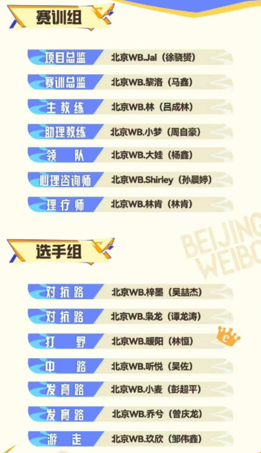 北京WB,主教练还是老林,没有换成黎洛。首发名单除了辅助换成玖欣之外,其他应该都和年总一致。在最近的邀请赛上他们还战胜了狼队拿到冠军。虽然比赛规模不大,还是非全局BP,但老林说最近他们都没怎么训练,全凭底子。首轮打大学生,WB没理由翻车,进入八强还是稳的。