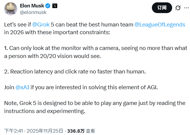 11月25日,有着硅谷钢铁侠之称的埃隆·马斯克,在其个人X平台上发布了一条消息,宣称目标是在2026年让其旗下AI产品Grok 5挑战《英雄联盟》的世界顶尖强队。他写道:"让我们看看Grok 5是否能在2026年,在以下重要限制条件下,击败最强的人类《英雄联盟》战队: