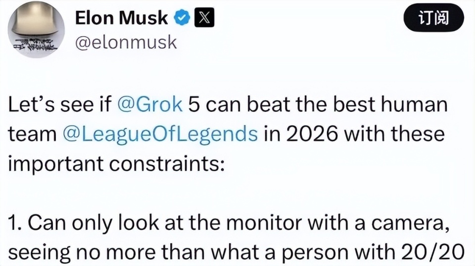 全球首富马斯克,于近日发文:将组建AD英雄联盟战队,并在26年,挑战最强人类战队,这番发言明显是在喊话今年夺冠的T1,得到消息的T1,在马斯克的文章下回应:我们准备好了,你呢?马斯克还对AI进行了限制,只能通过摄像头看显示器,反应和点击速度,都不能高于人类水平。