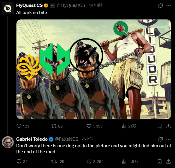 面对来自大洋彼岸的挑衅,当前贵为世界第一的巴西战队FURIA队长亲自下场应战,FalleN转发并下达“战书”:“别担心,还有一条狗没有出现在你的图像里,有能耐的话你会在这条路的尽头看到它。”根据Major当前赛制,作为一号种子的巴西豪门FURIA将直接在第三阶段登场,FlyQuest如果能在第二阶段继续保持自己的势头,那么他们才有机会在最后的传奇组挑战真正的强敌。