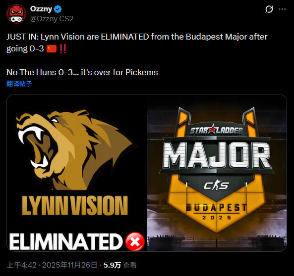 媒体人Ozzny赛后的动态在短短几小时内被近6万人查看:“最新消息:LVG在布达佩斯Major以0-3的成绩结束征程!!The Huns没有0-3……各位的作业全都毁啦!”