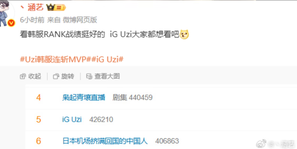 雷竞技资讯:涵艺曝光IGUzi登顶热搜,没买AD只是为等Uzi小明回归