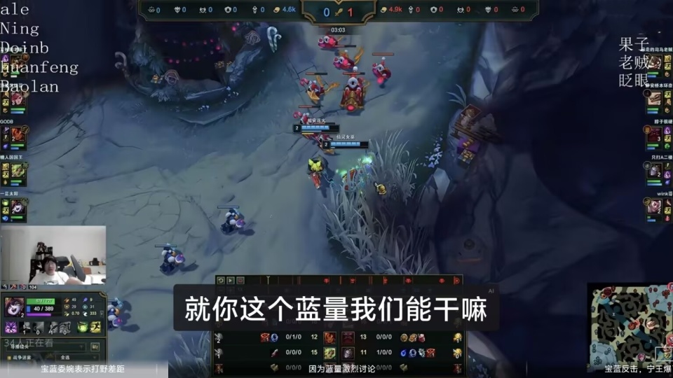 宝蓝指责Ning不来下路帮忙,但城墙哥觉得宝蓝没蓝,自己来了也没用,两人就因为这个问题,一直在吵架,最后宁王觉得没法沟通,直接就爆了,隔了没多久,宝蓝就跟Doinb说:我不打了,然后林伟翔也说不打了,看双人组都不打了,Doinb也不想打了,最后队伍里,只剩下上野了。