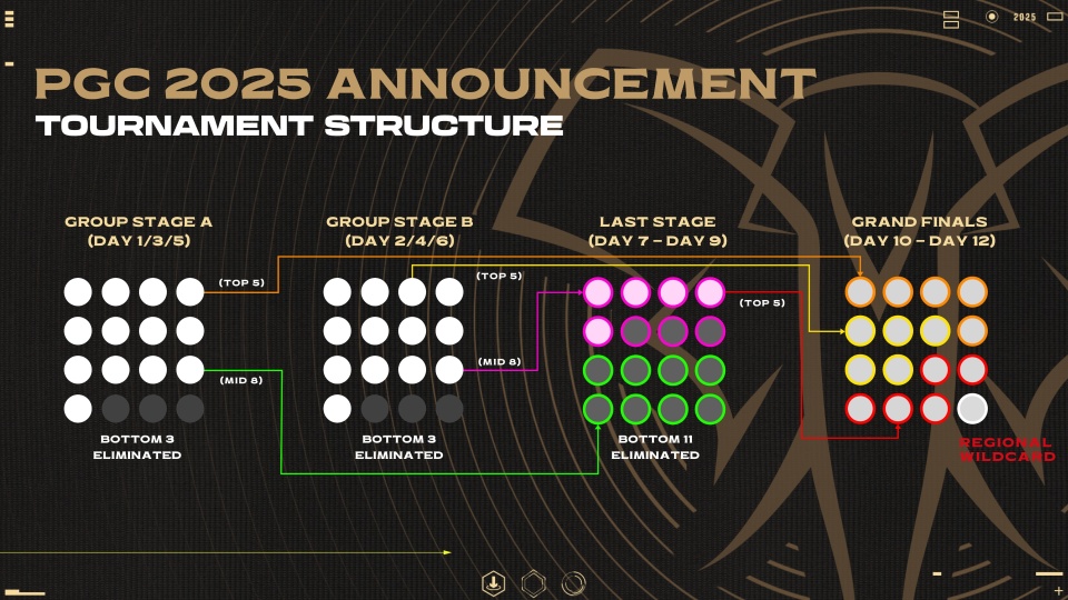 期待已久的绝地求生PGC2025世界赛终于要开始了,简单说一下本次PGC将于11月28日开始到12月14日结束,分为小组赛(6天),复活赛(3天)以及总决赛(3天)三个阶段,相较于之前,本次PGC的分组和晋级方式进行了一些改动。