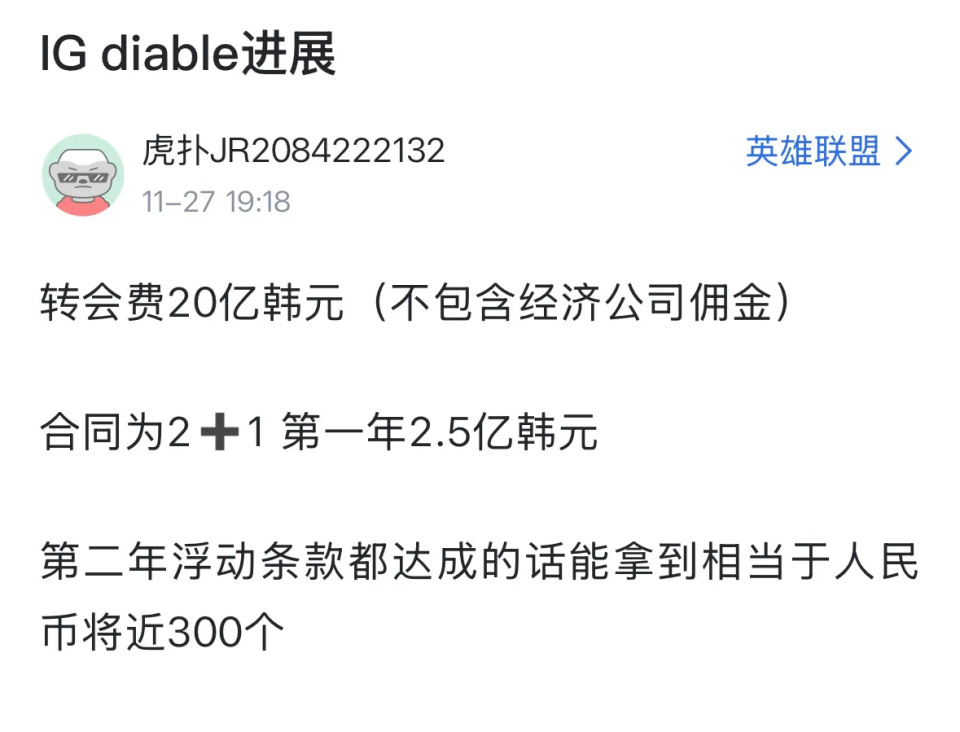 据网友爆料,现在IG战队和BFX战队的AD选手diable谈合同。首先是转会费用高达20亿韩元,大概也就是1000万RMB左右,而且这个价格是不包含经纪公司的佣金的。整个的工资水平并不高,合同是2+1的,第一年的工资应该只有2.5亿韩元左右,也就是120w,但第二年的浮动条款,如果能够达成的话,可以获得将近300w的工资。而且这个爆料人也公开表示,现在已经达成合同了,基本上确定IG战队的新AD选手是大菠萝。