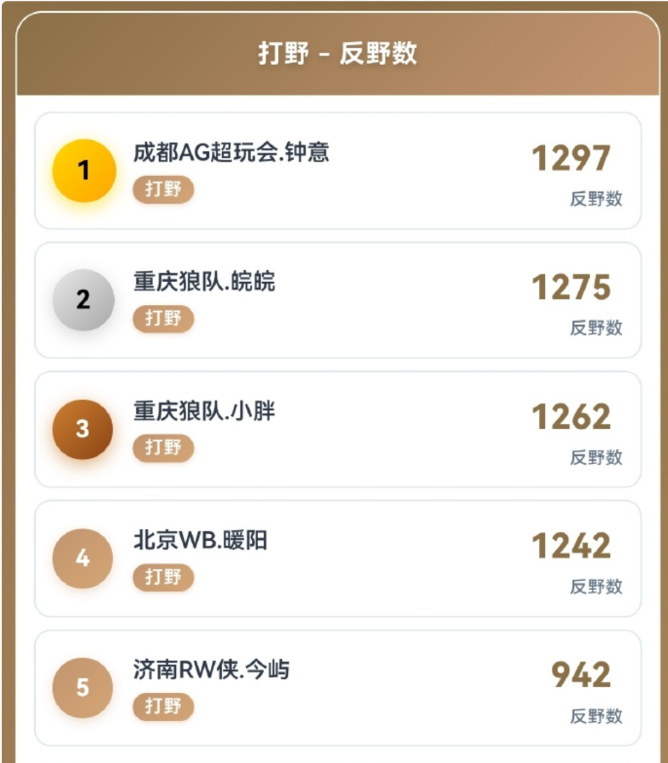 “反野数”是打野位资源运营最直观的展现方式,通过野区节奏布控主导游戏,压缩对手生存空间是顶级打野的核心量化指标,目前排名第一是AG钟意。