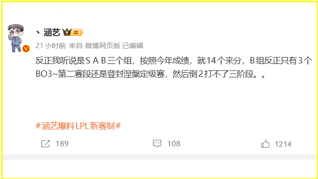 距离S16第一赛段到来,还有一个半月的时间,涵艺近日发文爆料新赛制,据他所说,明年第一赛段,会分成SAB三个组,具体分在哪儿,得看今年的成绩,B组只有3场BO3,也就是说只有4队(单循环),剩下的两个组,大概率是按46来分,有六个队的,应该是S组,季后赛前六的进。