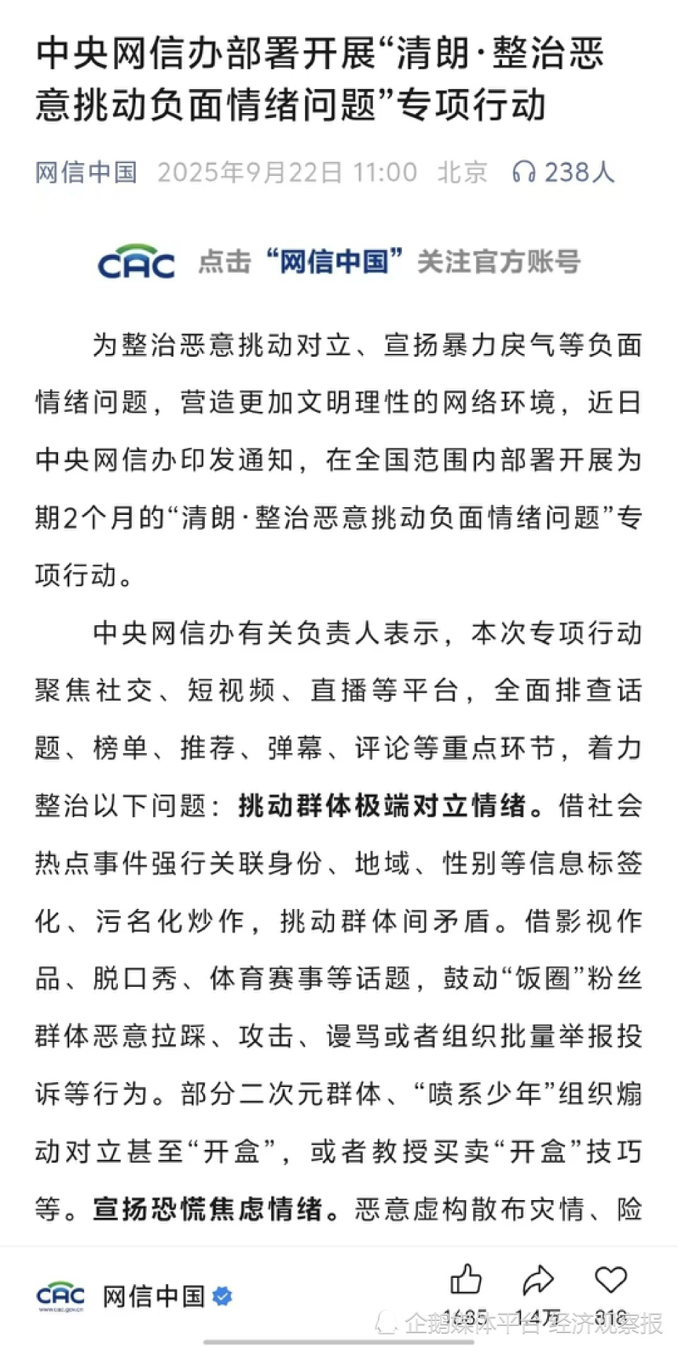 今年9月,中央网信办部署开展专项行动,明确将“挑动群体极端对立情绪”列为重点整治对象。