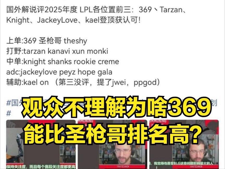 LOL外网知名网红教练(兼职LOL解说)YamatoCannon表示,LPL目前最强的五位选手分别是,上单369、打野Tarzan、中单左手、下路是JKL和辅助kael。而这个榜单出炉后,让很多圣枪哥粉丝不满,毕竟今年圣枪哥面对宙斯一场不输,反观TES上单369在面对宙斯的时候经常被抽陀螺,很多观众都不理解为啥,369能够被誉为LPL最强上单?