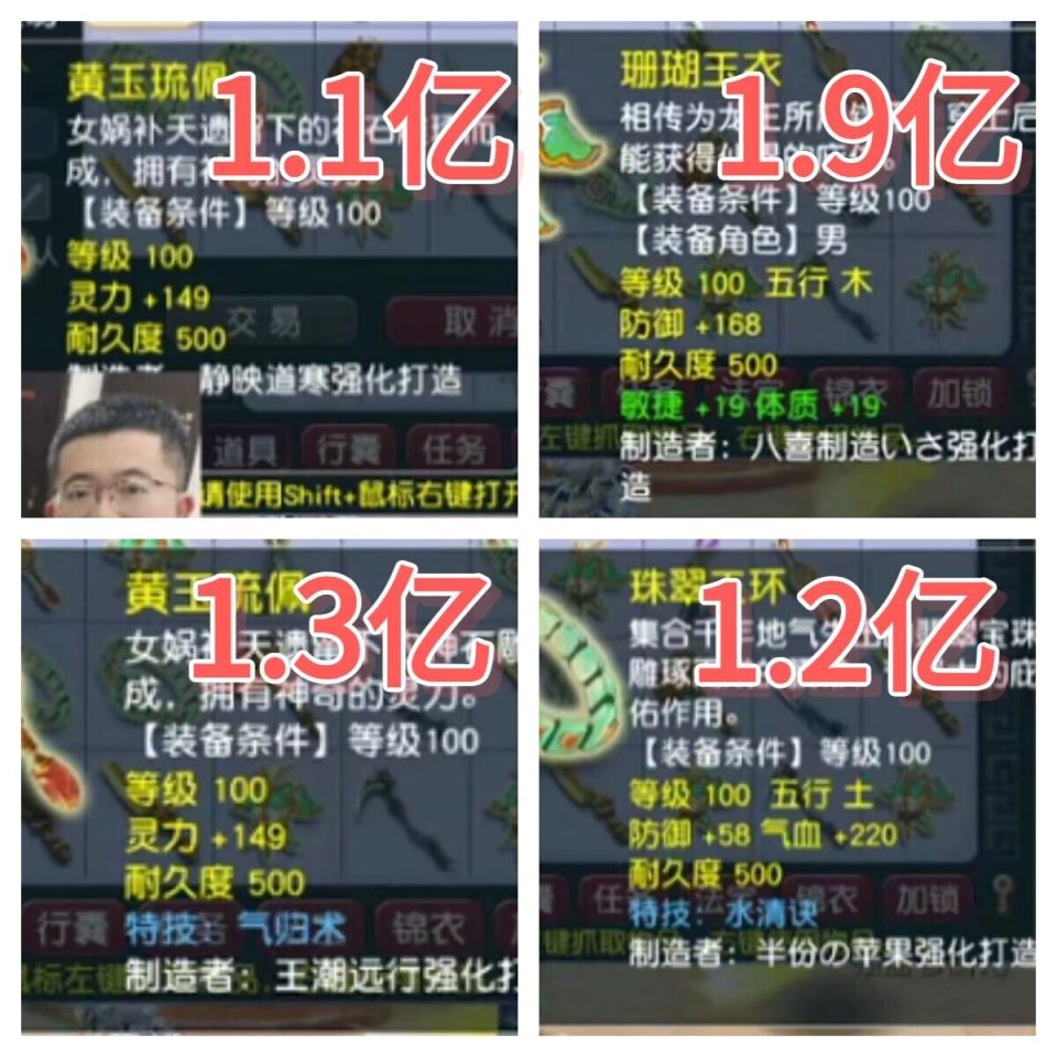100级149点初灵的项链是1.1亿成交的。100级的防御+168,敏捷+19,体质+19的男衣是1.9亿。100级149点初灵的气归术的项链是1.3亿。100级的防御+58,气血+220的水清诀的腰带是1.2亿!