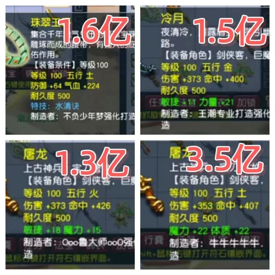 100级的防御+64,气血+224的水清诀的腰带是1.6亿成交。100级的伤害+373,命中+400,敏力双加33的刀是1.5亿成交。100级的伤害+373,命中+426,敏魔+33的刀1.3亿成交。100级的伤害+353,命中+407,体魔+44是3.5亿成交!
