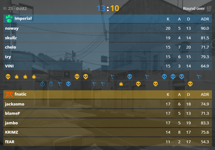 在Dust2,skullz与jambo两人各显神通,两支队伍半场握手言和。下半场双方你一分我一分,打出7平、8平、9平。长枪局起skullz、try和noway轮流站了出来,终局又是noway赢下残局拆包终结比赛,单图砍下20杀。