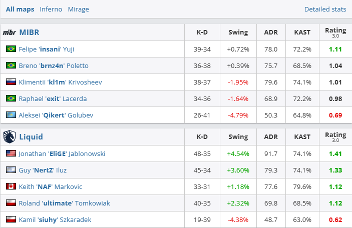 图一Inferno开局鸡哥便手感爆炸半场17杀,液体守出9-1梦幻开局。换边MIBR虽赢手枪局也仅追两分,长枪局起液体连拿4分轻松先下一城。