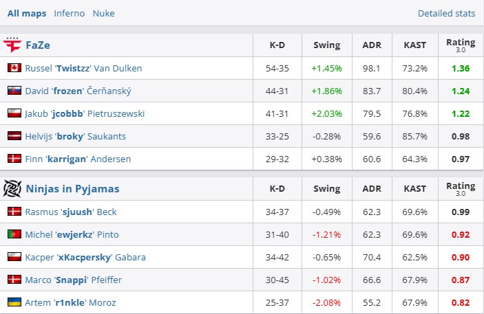 图二Nuke,NIP在0-3开局下依靠ewjerkz和sjuush两人的强大火力,半场进攻取得7分。换边双方你来我往,关键局broky在黄门单局3杀拿下2V4残局,FaZe追至11平还将对手打入经济局先取赛点,终局sjuush拖够时间追进加时。但加时赛与图一如出一辙,银河战舰连下4局终结比赛。