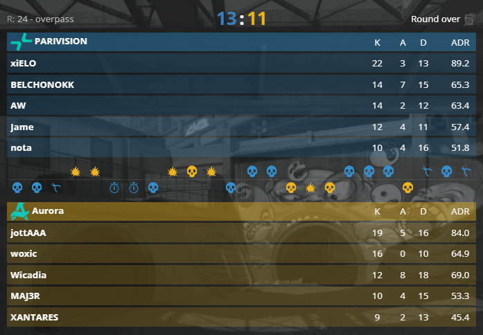 Overpass上两队你来我往,依靠jottAAA与狠人的领衔发威,土耳其队防守拿到7分。换边PV赢下手枪局后追至7平,尽管Aurora一度10-7反超,但凭借xiELO在下半场一枝独秀的表现,PV以一波6-1防守实现逆转。赛前晋级热门土耳其队,目前已濒临出局。