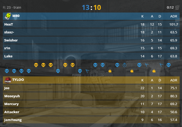 Train上Jee单局3杀拿下手枪局4-0开,长枪局M80抓住外场大狙两次空枪扑入外场取得首分,而后又以Tec-9完成经济局翻盘打出5-1攻势。依靠Moseyuh的抄后3杀,半场TYLOO守下7分。换边M80外场赢得手枪局,双方先后打成7平、8平、9平,TYLOO一把英雄大狙完成经济局翻盘。但长枪局起TYLOO大狙高坡空枪,而后队伍多次出现关键失误,M80以铁血防守终结比赛,TYLOO已两败濒临出局。