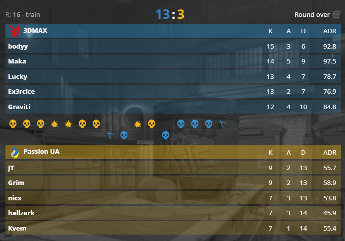 在Train,法国队赢得手枪局全员在线打出7-0进攻潮,半场手握9分。换边3DMAX再拿手枪局,比赛早早失去悬念。PUA进攻1分没拿便光速崩溃,目前两败命悬一线。