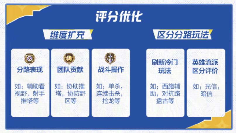 于是游戏在2024年11月开始将结算评分机制更加细化、覆盖的行为更广,甚至细致到每个英雄可能存在不同的计算标准。另一方面,为了促进玩家之间的沟通配合,也改进了匹配系统和BP流程,给予补位玩家额外奖励,将阵容纳入到匹配机制的算法中,还丰富了局内BP环节的便捷交互功能。玩家的积极对局行为、合作行为能够切实得到更多激励,也就觉得更能彰显自己的对局水平。