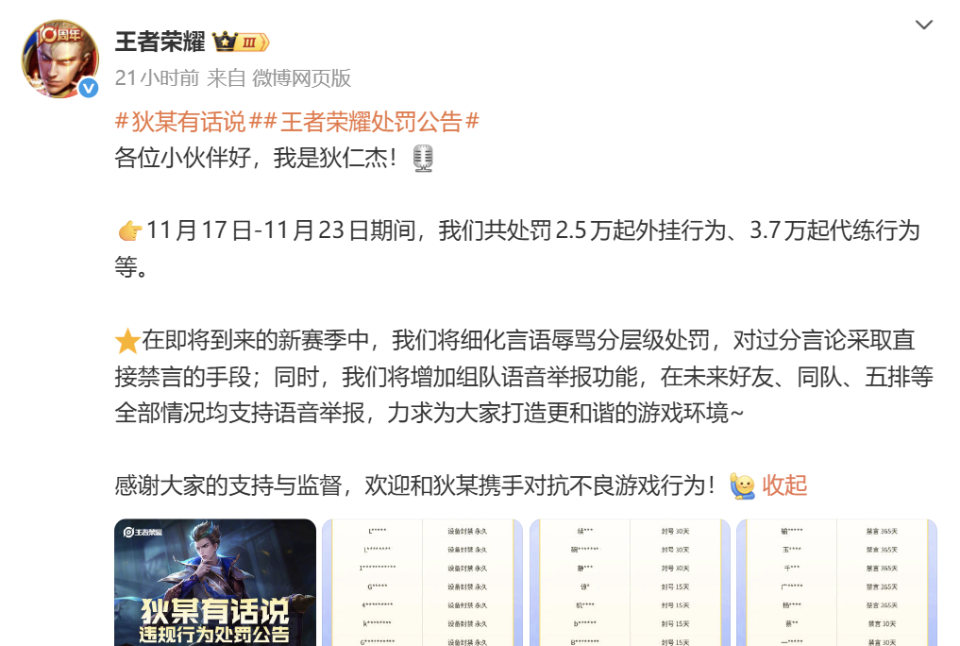 在最近一次惯例发布的处罚情况汇报中,游戏宣布下赛季起将细化言语辱骂分层级处罚,并将增加组队语音举报功能。这也是持续为净化游戏环境而努力,为玩家的游戏体验保驾护航。