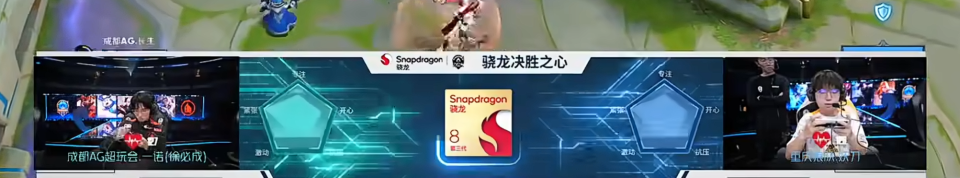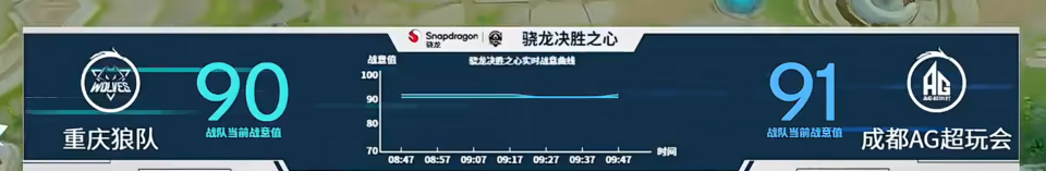 在比赛的关键时刻,屏幕下方会弹出名为“骁龙决胜之心”的数据面板。它将对阵双方的状态进行了同步可视化的对比——除了有实时跳动的,涵盖专注、开心、抗压等维度的五维雷达图,还会呈现出随时间变化的战意值曲线,还原两支战队在这一时间段内的心理博弈走势。