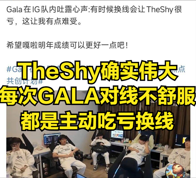经常看IG比赛的观众应该清楚,GALA虽然团队兜底能力很强,但是GALA在对线期间却有一些问题,这就导致IG每次换线都要牺牲TheShy的发育,从而来保证GALA的发育。当然也有不少IG粉丝吐槽IG管理层,宁愿开除打野JIEJIE也不愿意找一个新辅助,不少IG粉丝认为,GALA之所以对线频繁出现问题,就是辅助Meiko实力太糟糕,但凡IG愿意换个强力辅助,那么IG今年能走更远。