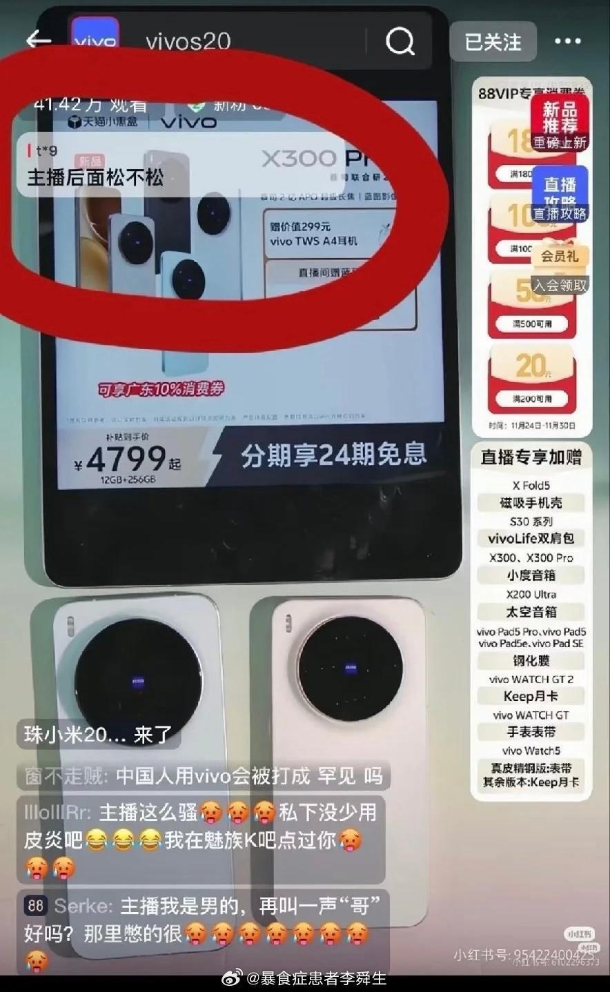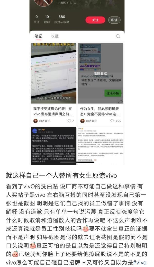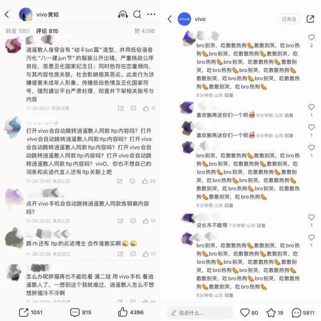 由于vivo发布X300手机时,曾邀请了多位B站UP主观看发布会,其中就包括逍遥散人;因此,这次事件也让vivo受到牵连,一些人去vivo直播间、官方评论区刷屏,大有不死不休的架势。11月29日,vivo直播间涌入大量与产品无关的评论,直播人员面对突发状况把评论区个别诋毁性评论意外置顶,其中也包括辱骂直播人员的评论。但极端人员直接给vivo捏造“排斥女性用户”等不实言论,开始无差别攻击各类与vivo相关的内容。