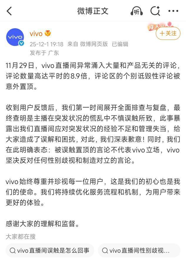 面对汹涌而来的负面舆论,vivo官方也给出了解释:“被误触置顶的言论不代表vivo立场,vivo坚决反对任何性别歧视和制造对立的言论。”